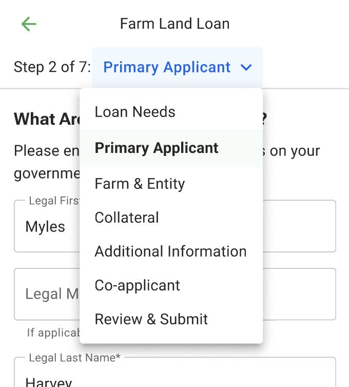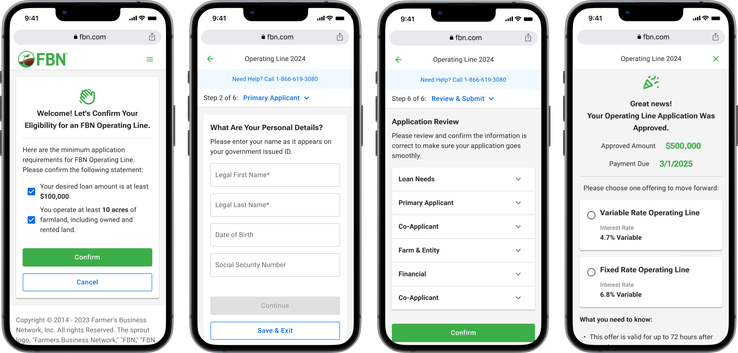 Farmers Business Network is a platform that helps family farmers maximize their profit potential with data and technology. In 2021, a Finance product team was created to scale operations through technology, offering streamlined loan services. As the founding designer, my focus is on the middle of the funnel loan experience, and tasked with establishing foundational design standards for the loan application process.