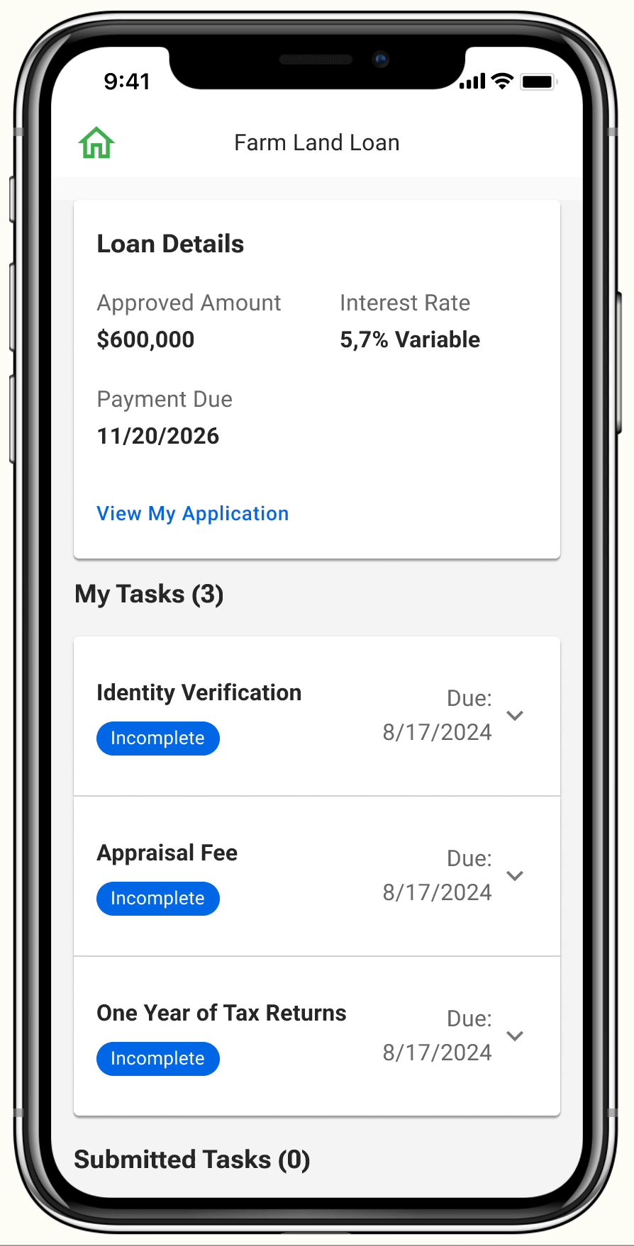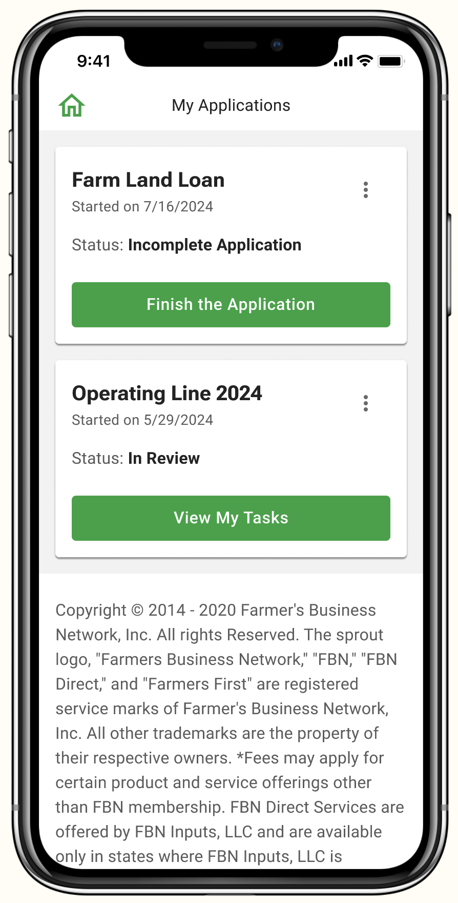 The hub for all work-in-progress applications. The status and contextual buttons help inform farmers about the next steps.