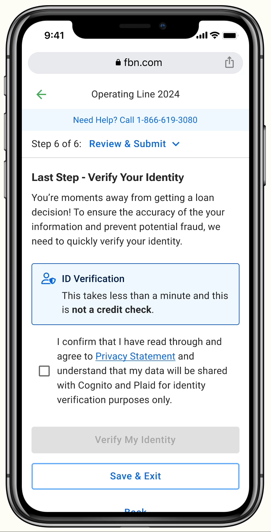 For certain loan versions, farmers are required to verify their identity before submitting the application. The process takes less than 1 minute with minimal input.